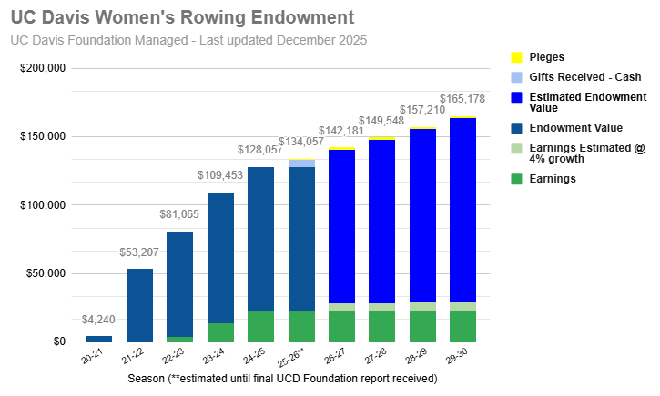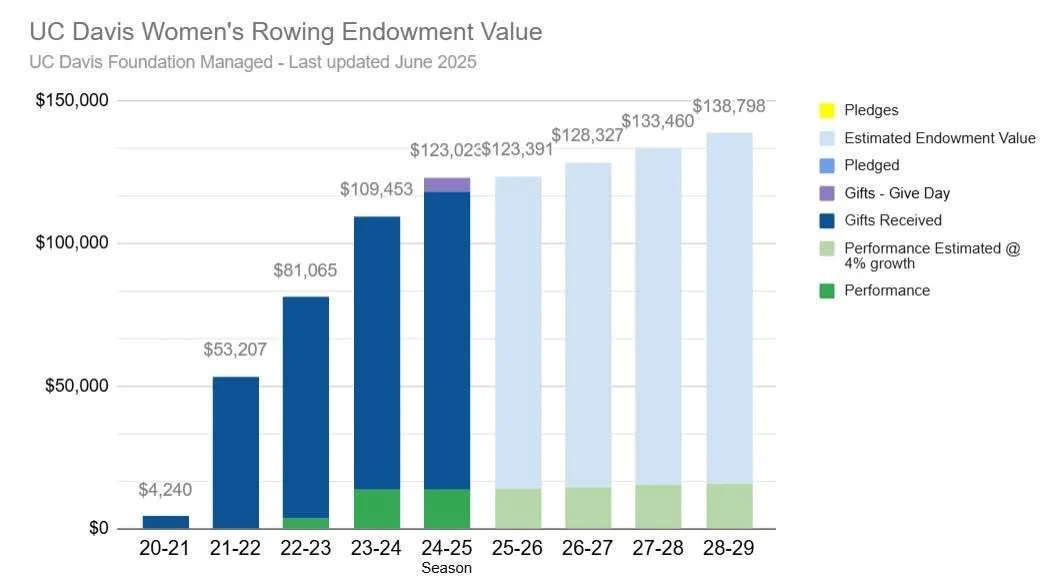Our UC Davis Women’s Rowing Endowment Fund supports operations, equipment replacement, and coaching. The more we can grow the fund, the bigger the impact we’ll have on the future of our team! The team will receive a 4% annual payout each academic year in perpetuity from the fund, with the principal invested and managed by UC Davis.